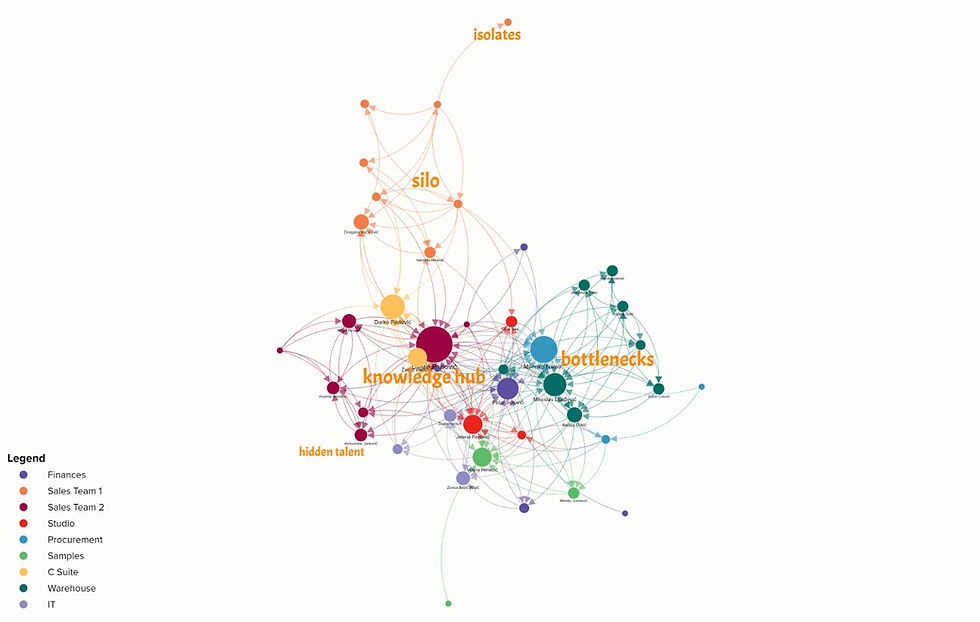 3. Data analysis through visual representation of different networks (information, expertise, trust innovation, etc.), including positioning of individuals and calculation of relevant network metrics and indicators. 4. Follow up with stakeholders to discuss preliminary ONA results, draw out further qualitative observations and clarifications about the networks’ functioning. 5. Report with main findings, including a set of detailed recommendations on how to increase network effectiveness and overall organizational functioning in key business areas.